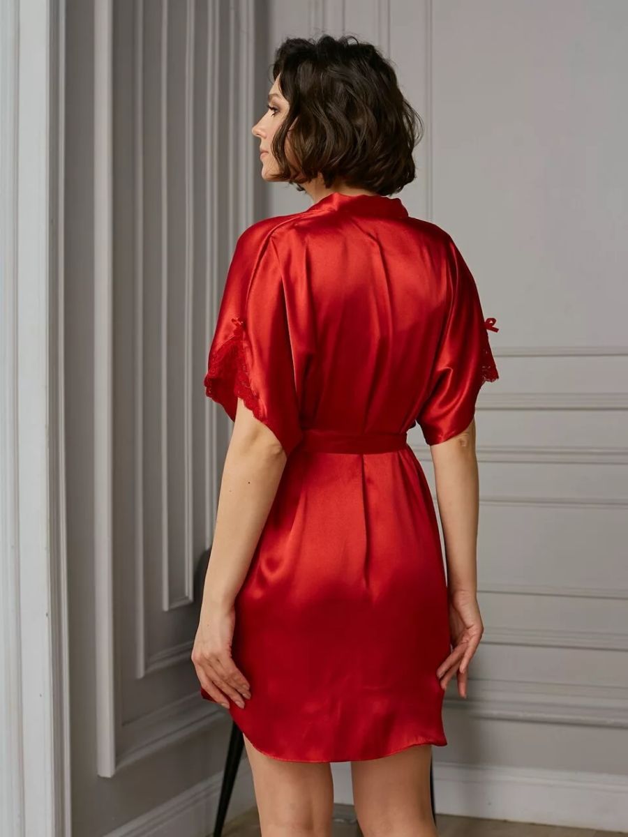 Короткий халат на запах из искусственного шелка, декорирован кружевом по рукаву.