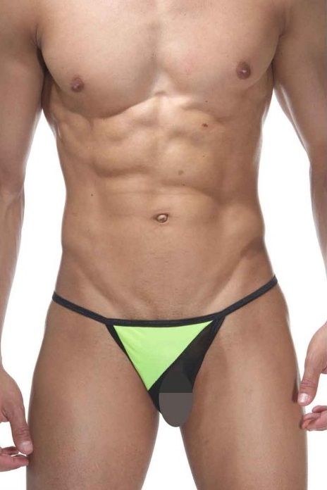 Трусы-стринги для мужчин, с открытыми гениталиями, на тонкой резинке. Спереди декорированы ярким гладким контрастным треугольником.