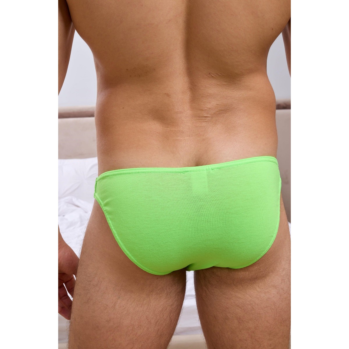 Салатовые мужские трусы-слипы с узким бочком.