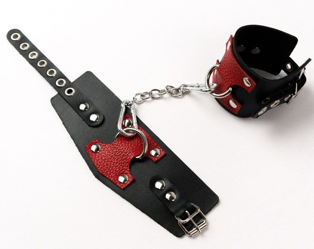 Кожаные оковы с контрастными вставками имеют регулируемые ремешки. Оковы снабжены металлическими кольцами и сцепкой.