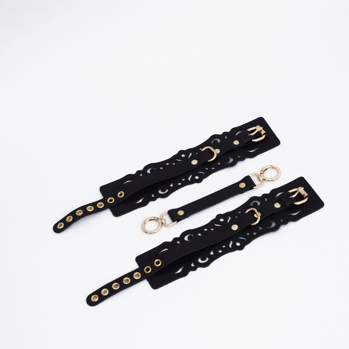 Оковы с узорным дизайном из натуральной кожи с золотой фурнитурой. Резные элементы придают атмосферу нежности, элегантности и подчеркивают красоту тела. Регулируются ремешком, а также в комплекте прочный соединитель с двумя карабинами. Доставляется в фирменной упаковке в виде брендированной деревянной подложки. Длина манжеты - 25,5 см. Ширина манжеты - 7 см. Обхват - 24-33 см.